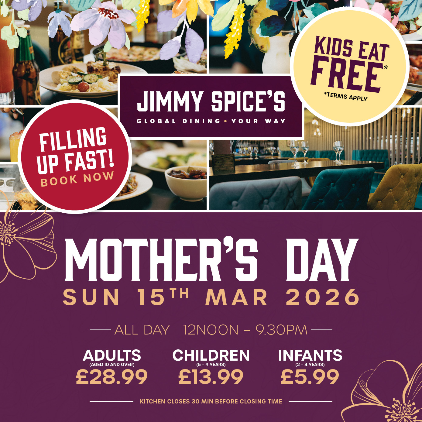 *Terms & Conditions: Each full-paying adult buffet purchase qualifies for one FREE kids’ buffet meal. Offer not valid for children over the age of 9. You MUST pre-book to avail this offer. Offer must be redeemed during the same sitting. Employees of Jimmy Spice’s are excluded from participation. Offer cannot be combined with other offers or vouchers. Maximum discount £50. The promoter reserves the right to amend or withdraw any part of the promotion as deemed necessary due to circumstances out of its control. Acceptance of this offer is at the discretion of the restaurant manager. Restaurant reserves the right to ask for a valid identification as a proof of age.